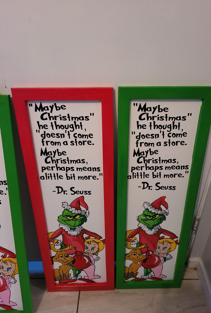 Each unique sign, available in charming designs such as the whimsical Grinch hand, The Grinch or the delightful Grinch Trio, measures a substantial 12x36 inches.