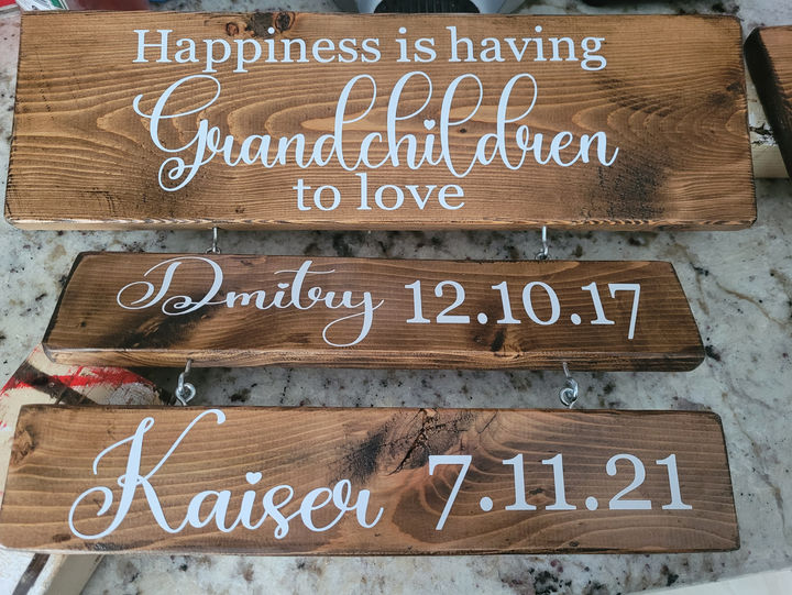 The smaller name boards measure at 14 x 2.5 inches, and the finish matches the main board. We will just need the name and birthdate to add to the board. Each name board is $12.50.